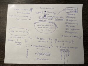 This week, I attempted Sketchnoting while listening to a TEDtalk by Julian Treasure on the topic of effective communication. Although this is a video, I listened to the audio only to focus on my sketchnoting and creating my own visual experience. This was my first experience taking notes from learning material in this way and at first it did not feel natural to me. While listening to the talk, I found that I was worried about not transcribing all the information presented and missing important points. However, when I was finished I found that I could follow my sketchnote and remember the lecture. After completing this activity, I do see value in combining images with notes to aid in retention of material as discussed by Rachel Smith. I am curious to see if this absorption of the material is held over time and will come back to my sketch note at a later date to test this.