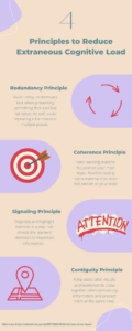 Alt Text: An infographic displaying the 4 principles used to reduce extraneous cognitive load: The redundancy principle, the coherence principle, the signaling principle, and the contiguity principle.