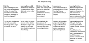 This week I created a lesson plan teaching the lifecycle of a frog. I created this lesson based on backwards design and started with the goal of learning the life cycle of a frog, I then began to work backwards by creating an associated learning assessment and creating learning outcomes and evidences of learning to meet that goal and prepare learners for the learning assessment.
