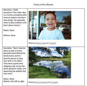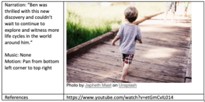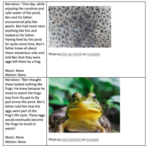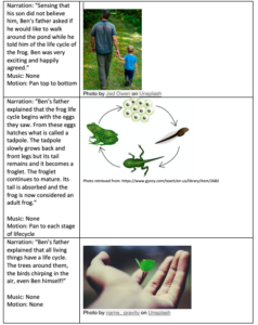 At first, I found creating a story board difficult as I had trouble determining what it was that I wanted to teach through a story. I decided to create my storyboard this week in the same theme of my lesson plan and create a story involving life cycles. However, I made the learning outcome for this story simpler in order to fit into a short story context and I wanted my story to have a children’s book feel to it. If this storyboard were to be used for learning material, it would likely be a different age/learning ability than my lesson plan was created for in my last blog.